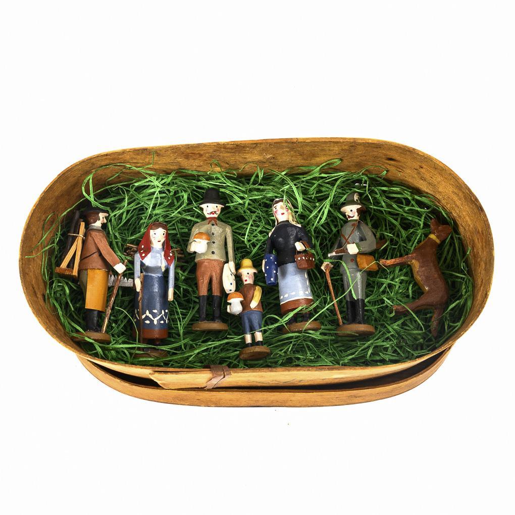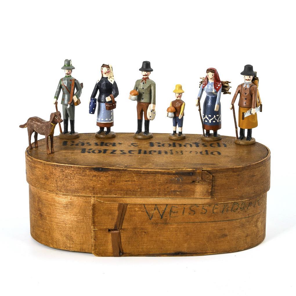 Im alten Stil gestaltete Figuren: Jäger, Holzfäller, Reisig-Sammlerin, Mann und Kind mit Pilz, Frau mit Krug und Hund. Ovale Schachtel mit schablonierter Aufschrift "Bässler & Robatsch", 9 x 25 x 13,5 cm.