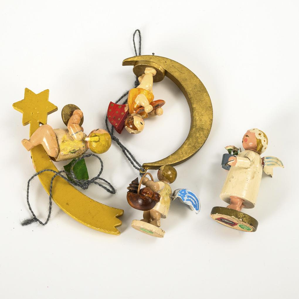 Sitzender Engel am Flügel, 4 musizierende Engel, 2 Engelchen mit Geschenken und 2 musizierende Engel auf Halbmond bzw. Stern. Defekte, Klebestellen, 1 Flügel fehlt.