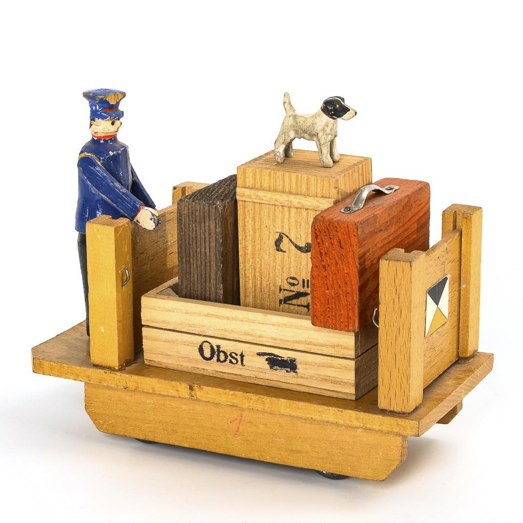 Figur in blauer Uniform, auf Gepäckwagen mit 3 Koffern und Hündchen. Figur mit kleinen Defekten, Wagen und Gepäck wohl jünger.