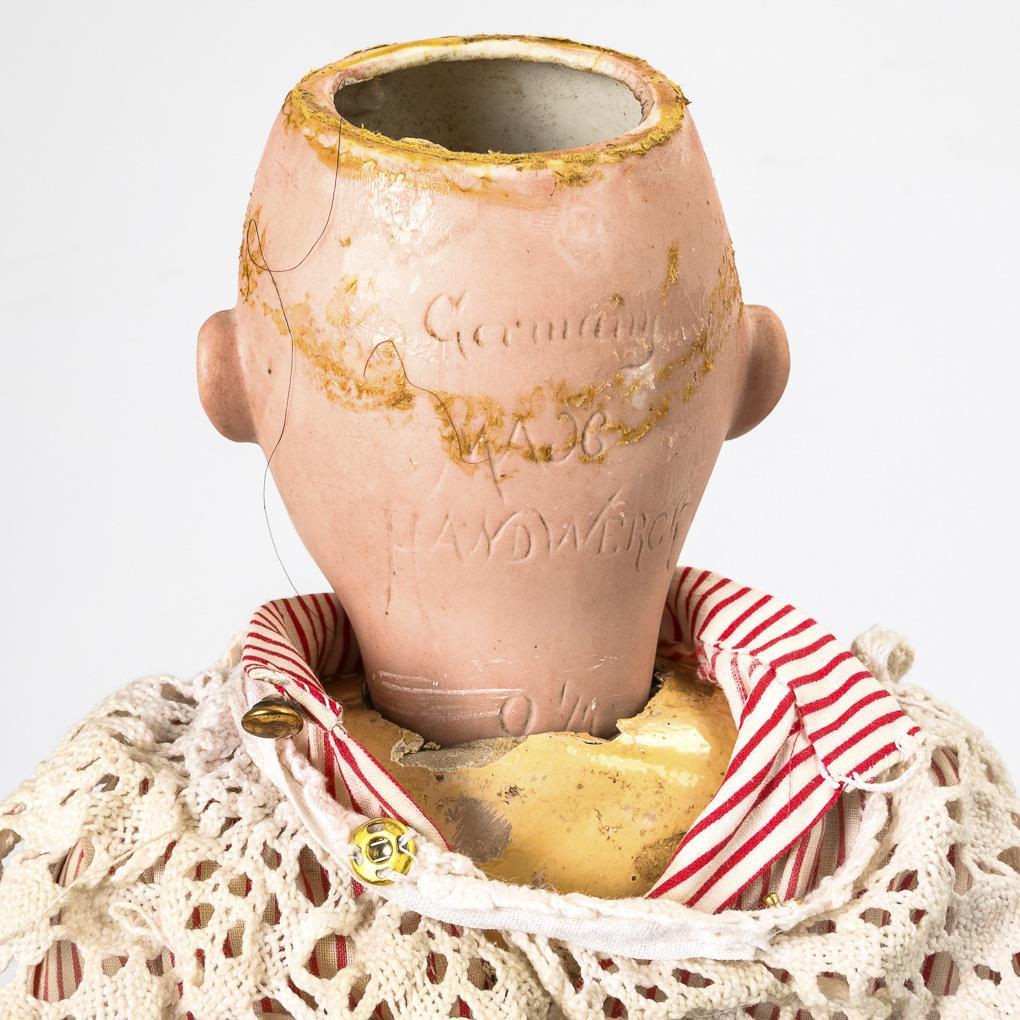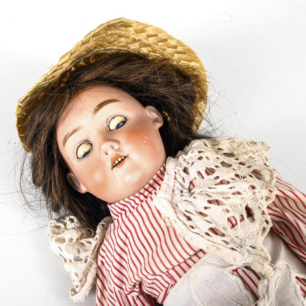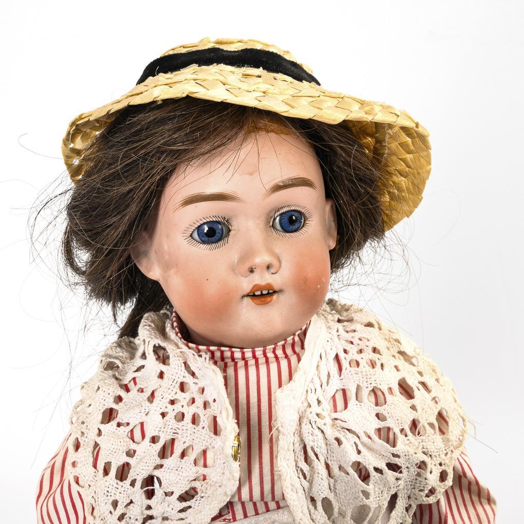 Kurbelkopf, blaue Schlafaugen, dunkelbraune Echthaarperücke. 13-teiliger Gliederkörper. Rot-weiß gestreiftes Kleid, Strohhut, alte braune Lederschuhe. Dazu kleines "Stettiner Puppen-Kochbuch. Ueberreicht von Richard Braun". Kopf durchleuchtet: ohne Defekte. Körper sehr stramm gespannt und berieben, 1 Finger fehlt.