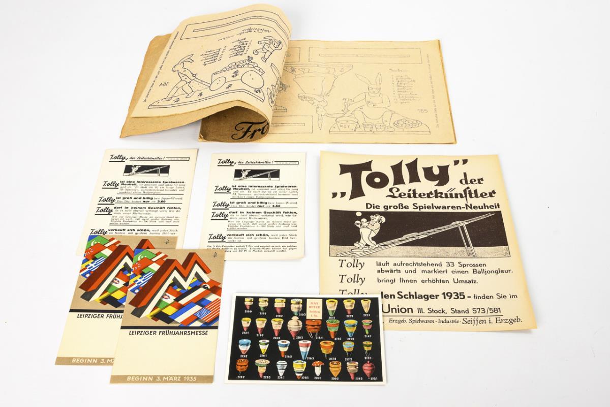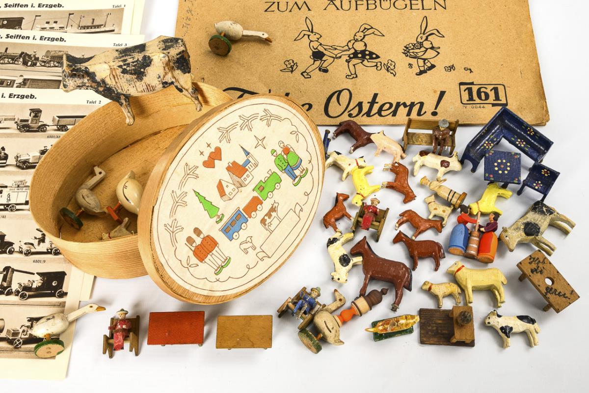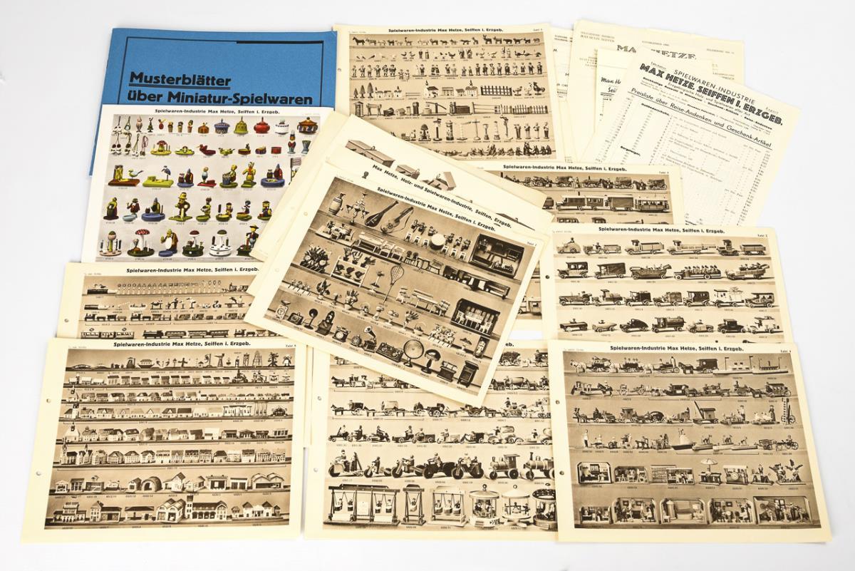 1x Reprint-Katalog "Musterblätter über Miniatur-Spielwaren. Spielwaren-Industrie Max Hetze, Seiffen-Ergeb.", dazu einige alte, originale Musterblätter, eine Preisliste, Firmenbögen und Postkarten. / 1x "Hartmanns Patentierte Laubsäge-Vorlagen zum Aufbügeln. Frohe Ostern", Nr. 161". / Ovale Spielzeug-Schachtel mit Miniatur-Möbeln, Reifentieren und einigen Figuren.