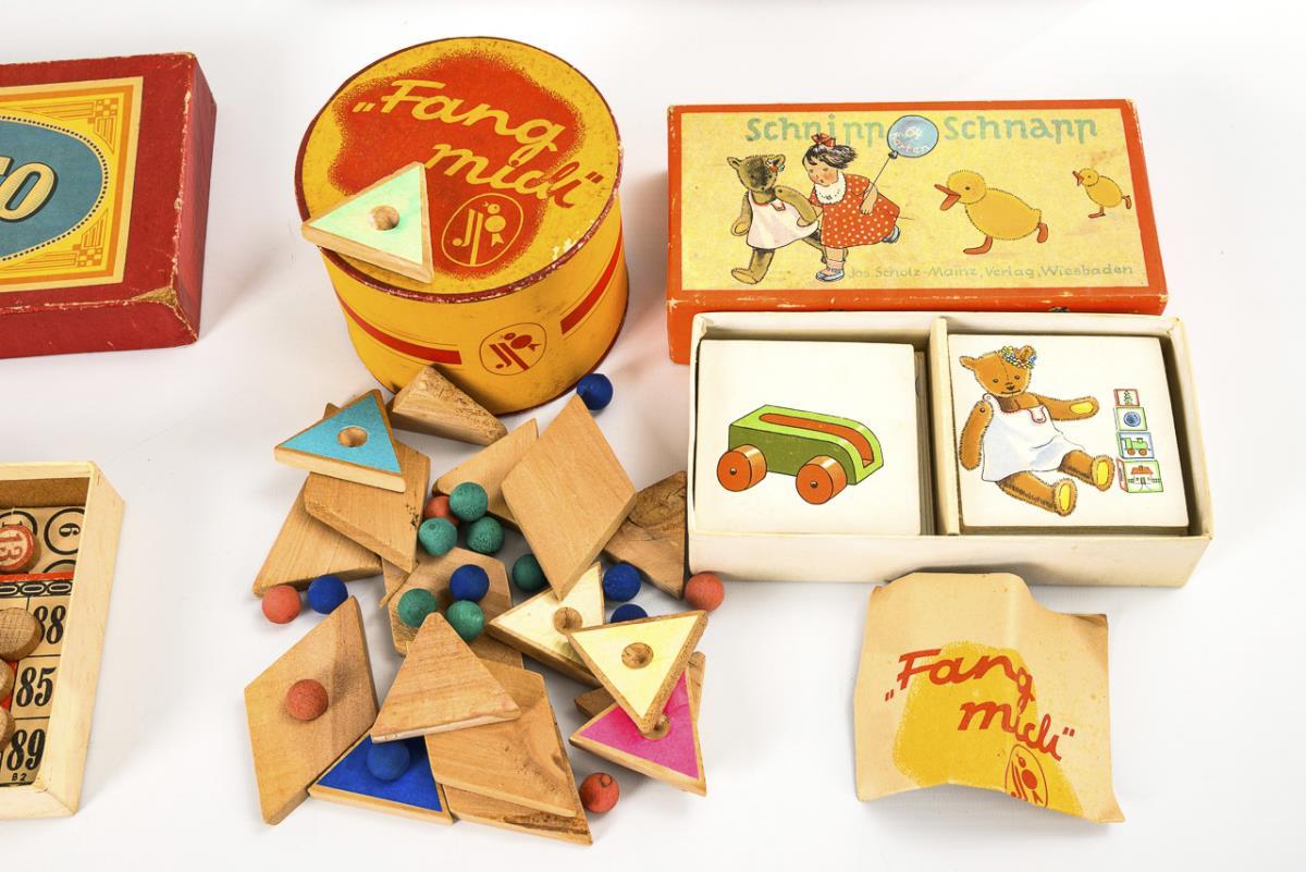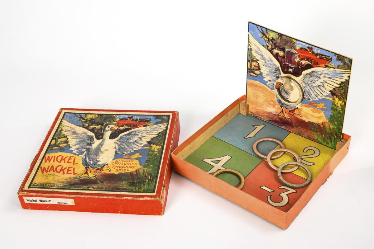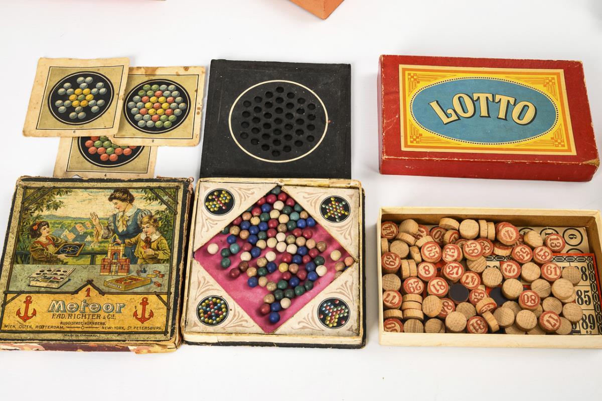 "Wickel-Wackel", Spears Drolliges Ringwurf-Spiel. J.W. Spear & Söhne, Nürnberg. / Kartenspiel "Schnipp-Schnapp", Jos. Scholz, Mainz. / "Meteor Nr. 1", F. Ad. Richter & Cie, Rudolstadt. / "Lotto". Ohne Herstellerangabe. / "Fang mich". Ein Gesellschafts- und Legespiel. / "Die fliegenden Hüte". J.W. Spear & Söhne, Nürnberg. Bespielt, teils mit Defekten. Vollständigkeit nicht geprüft.