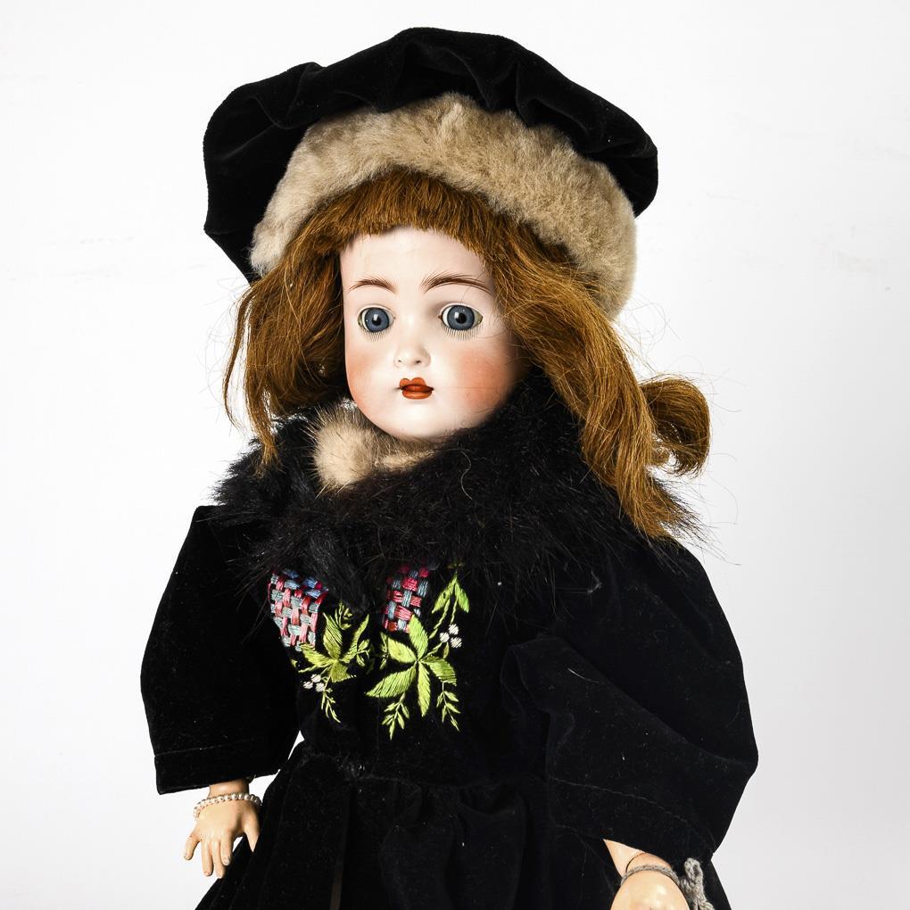 Kurbelkopf, blaue Schlafaugen, offener Mund mit beweglicher Zunge, hellbraune Echthaarperücke. 15-teiliger Gliederkörper. Kleid mit Fellkragen, passende Mütze, braune Lederschuhe. 2 Kopfnähte minimal brandrissig.