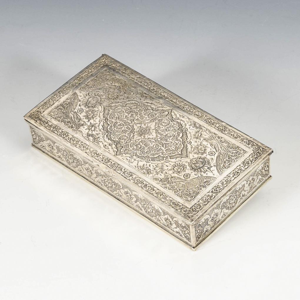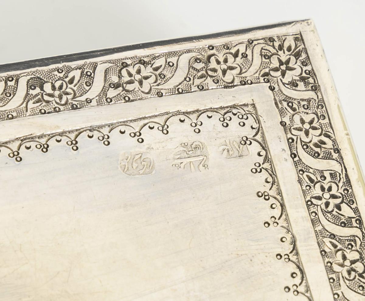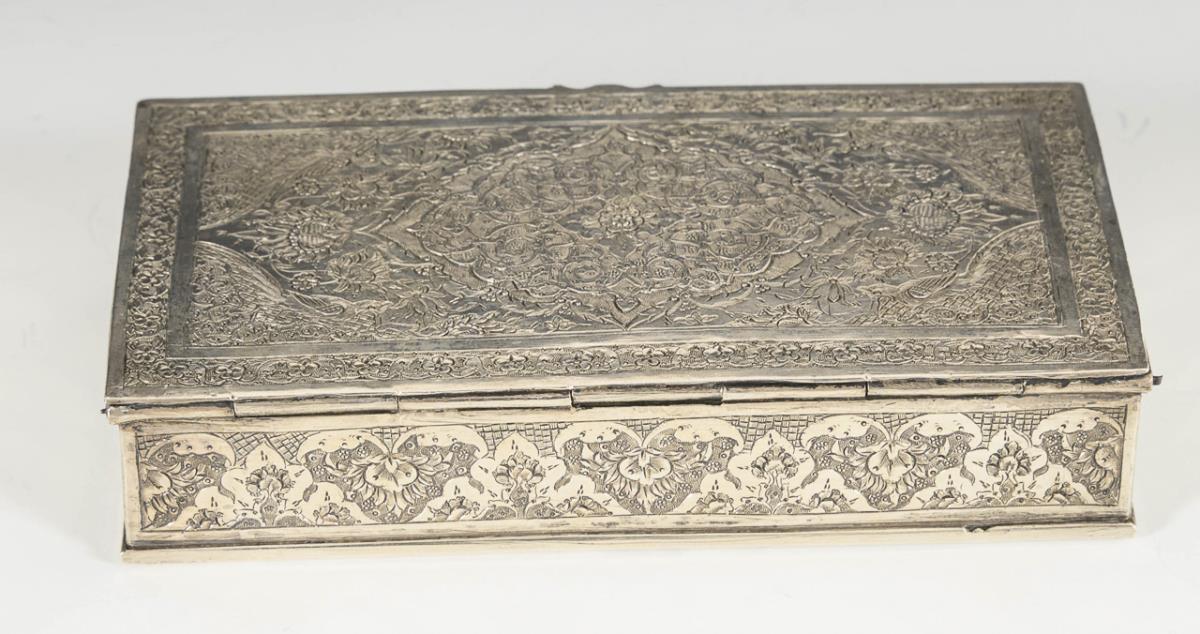 Rechteckige Schatulle mit Scharnierdeckel, fein graviert und punziert.