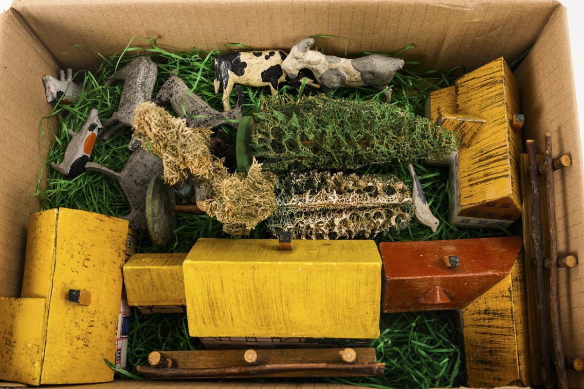 4 Bauernhäuser, 8 Reifentiere, 3 Bäume und 2 Zäune. Klebestellen, 1 Bein ergänzt.