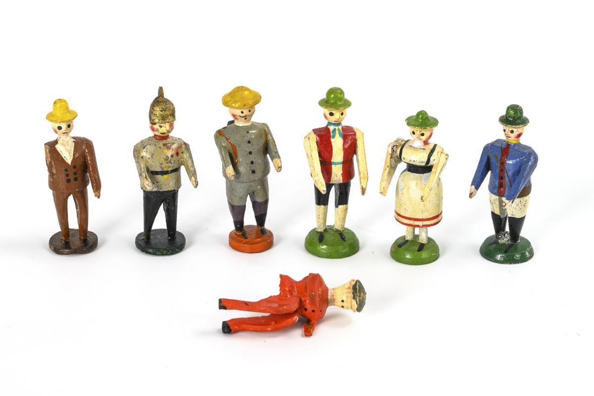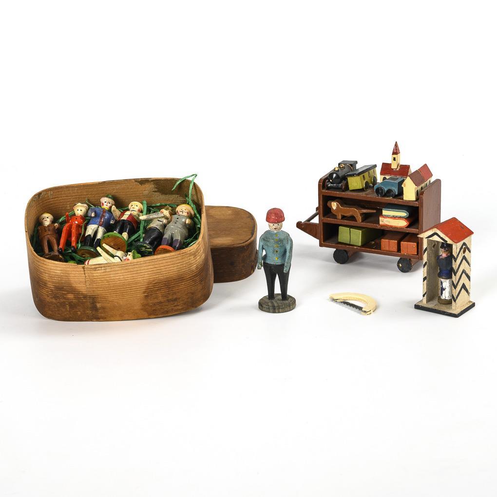 Spielzeugverkäufer mit Wagen, Schilderhaus mit Soldat, 6 Figuren und eine Fahrerfigur. In kleiner Spanschachtel, 4,5 x 9,5 x 6,5 cm. Kleine Defekte, 2x Arme fehlend.
