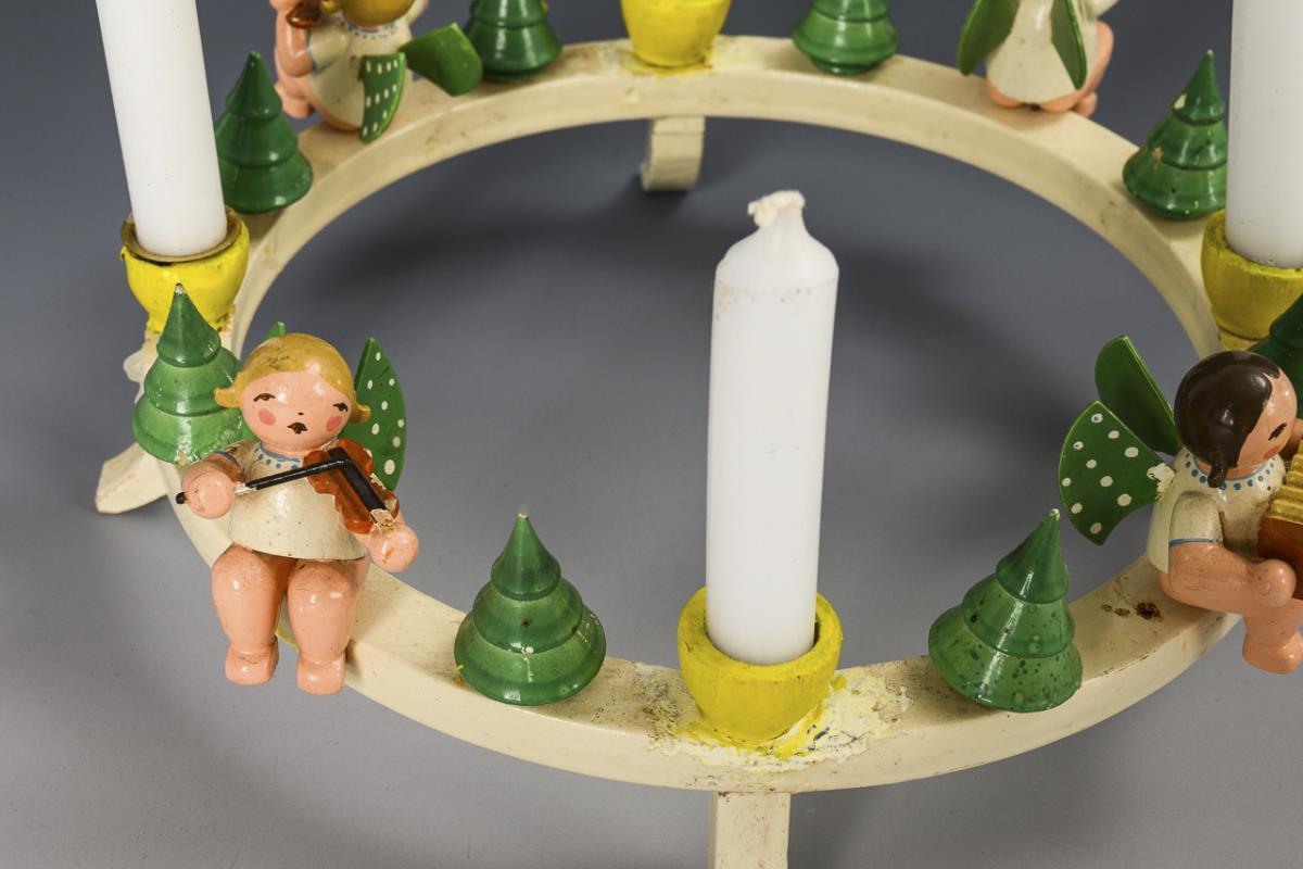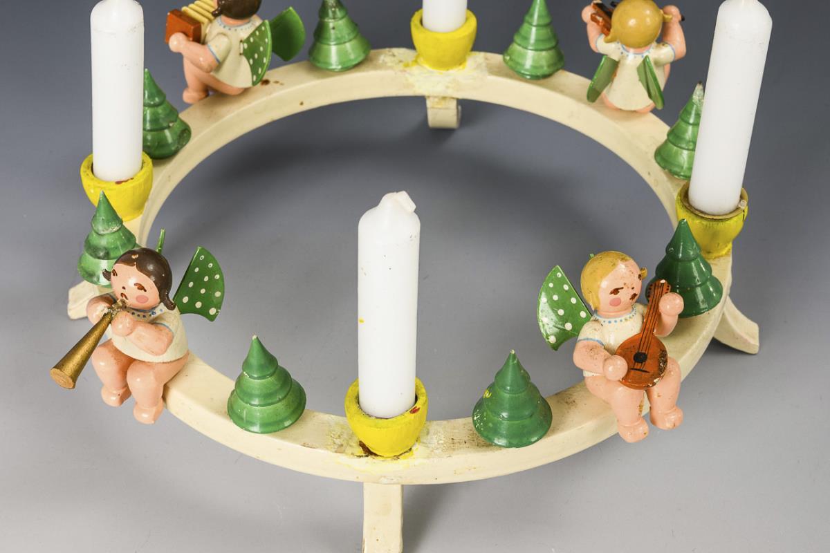 Runder Holzkranz mit 4 musizierenden Engelchen, 4 Kerzen und 8 Tannenbäumchen. Reparaturspuren, Tüllen übermalt.