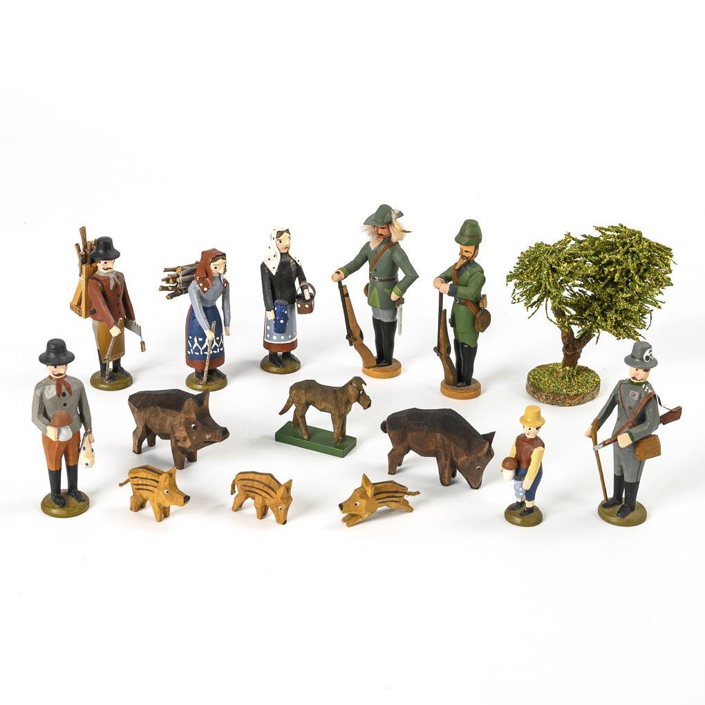 15 Teile. 3 Jäger, Hund, 5 Wildschweine, 2 Reisig-Sammler, 3-köpfige Familie mit Pilzen und Krügen, dazu 1 Baum.