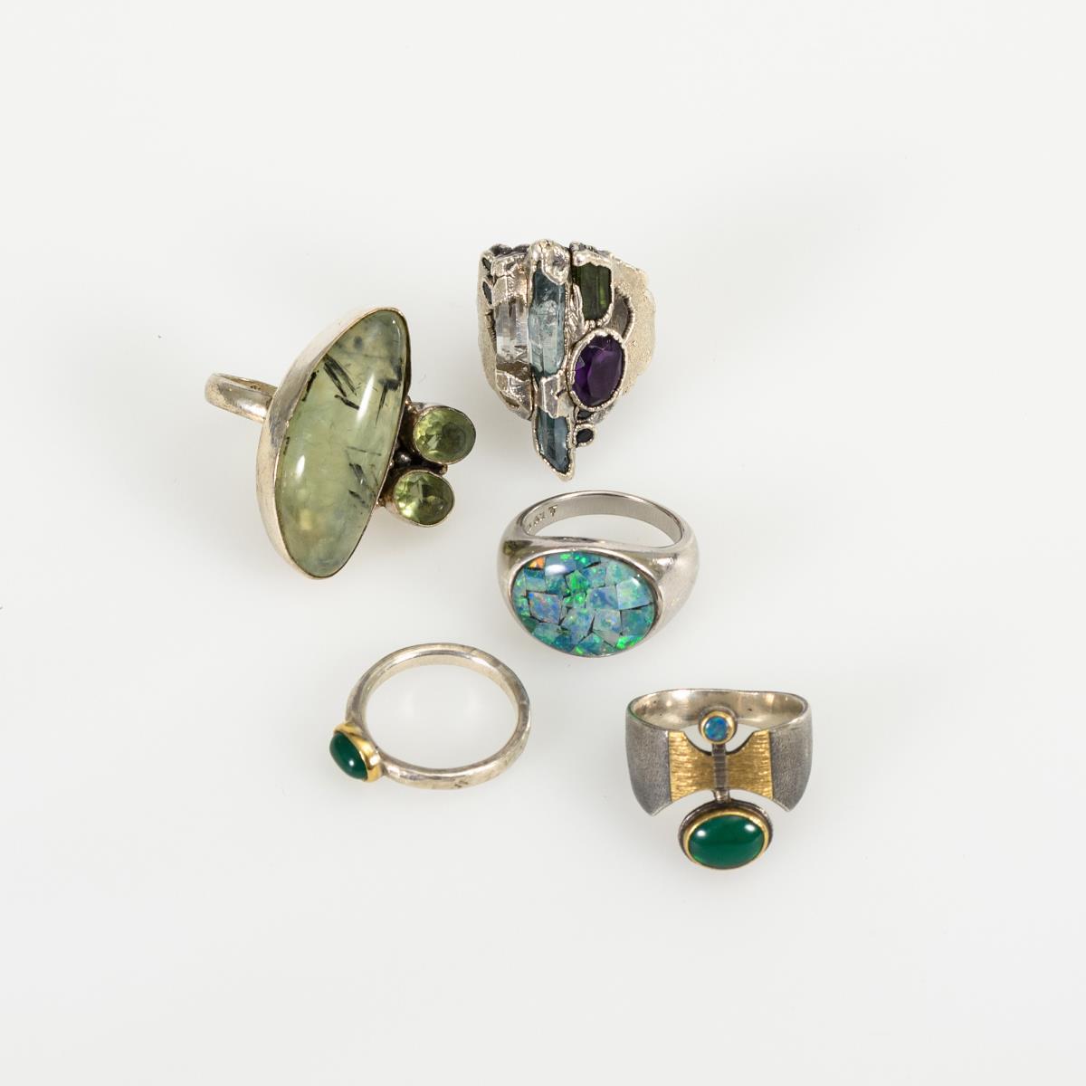5 Designer-Ringe mit verschiedenen Steinen.