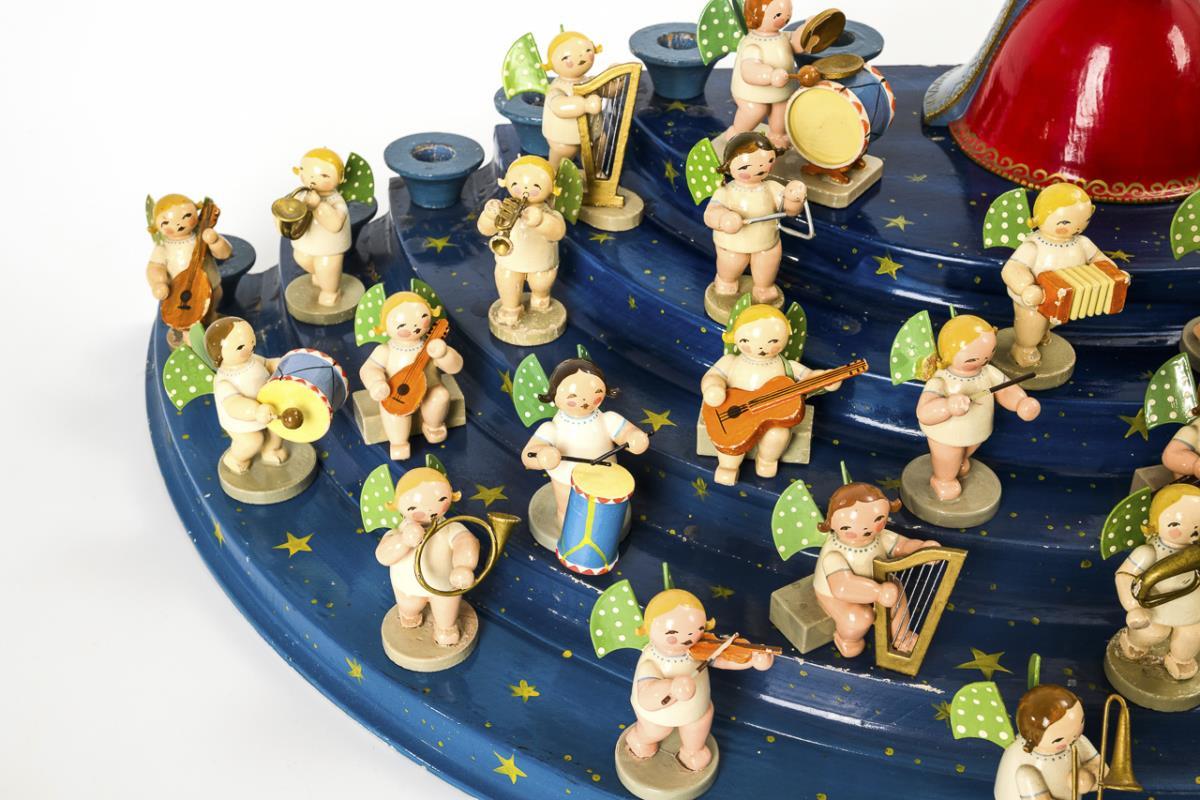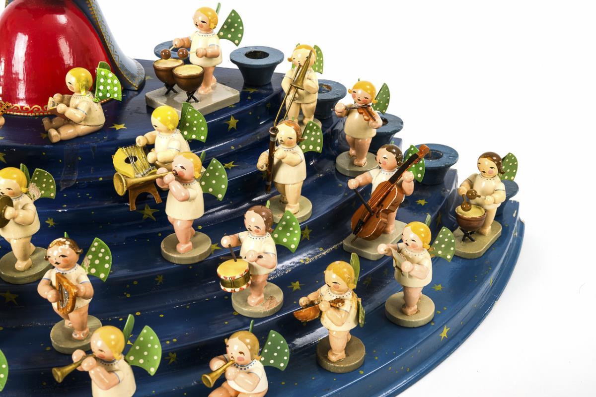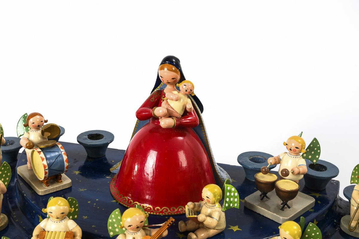 Halbkreisförmige Treppe mit 12 Kerzentüllen. Dazu Maria mit engelsgleichem Christkind und ca. 38 musizierende Engel. Teils mit Defekten und Farbabplatzern.