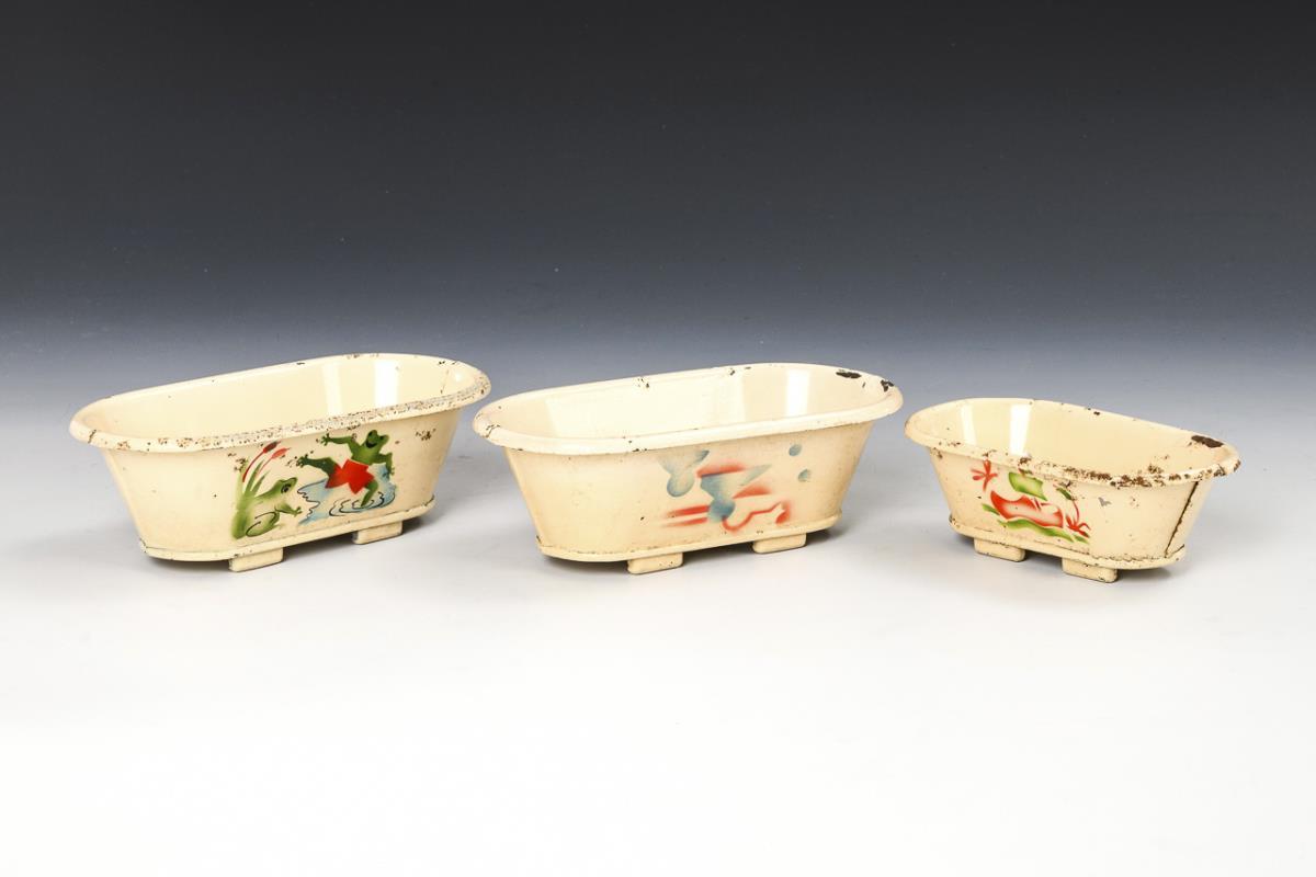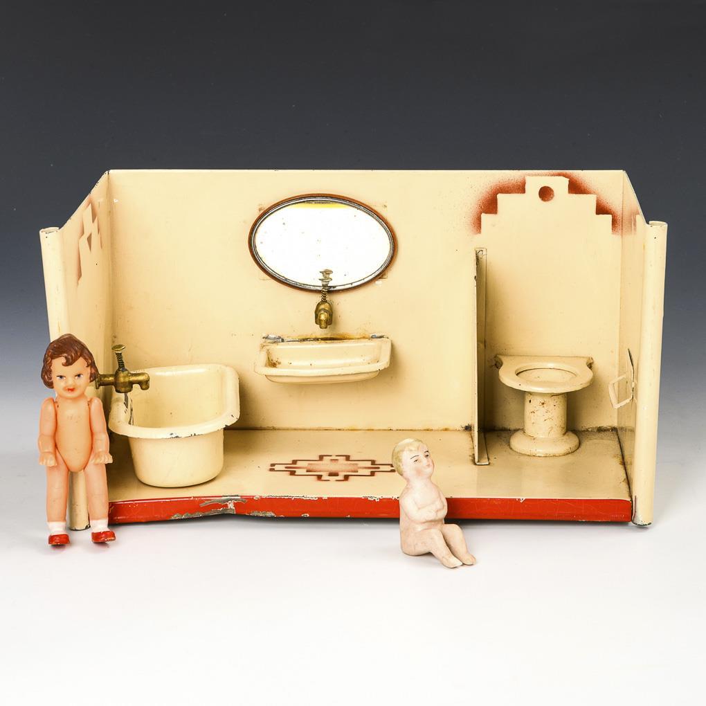 Kleines Blechgehäuse mit Badewanne, Waschbecken, Spiegel und Toilette, sowie 2 Wasserbehältern an der Außenseite. Dazu 2 Püppchen, 4 kleine und 4 größere Badewannen. Delle an der Front, kleine Lackdefekte. Ganzbiskuitfigur mit Defekten.