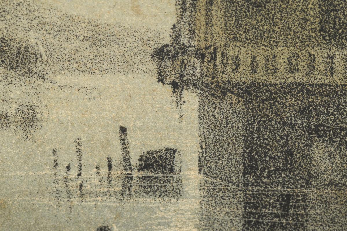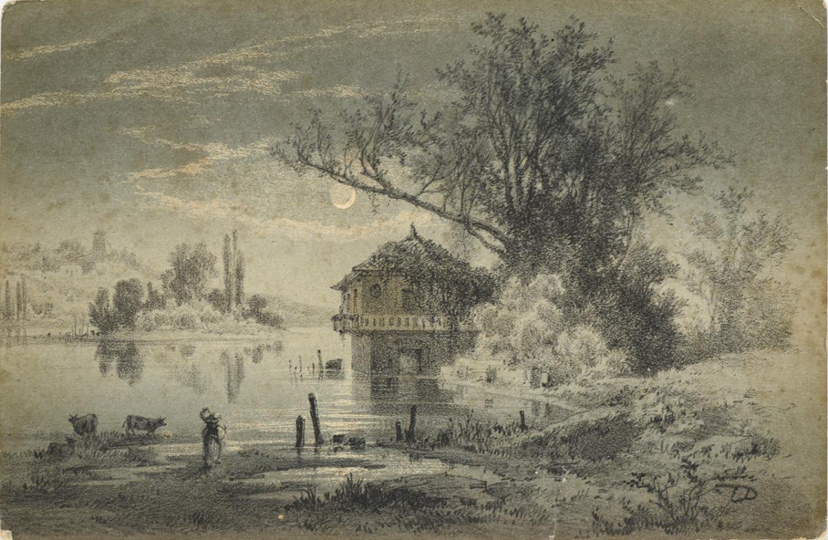 Uferlandschaft mit Gebäude im Schein des Mondlichts. Eine restaurierte Stelle mit Hinterklebung.