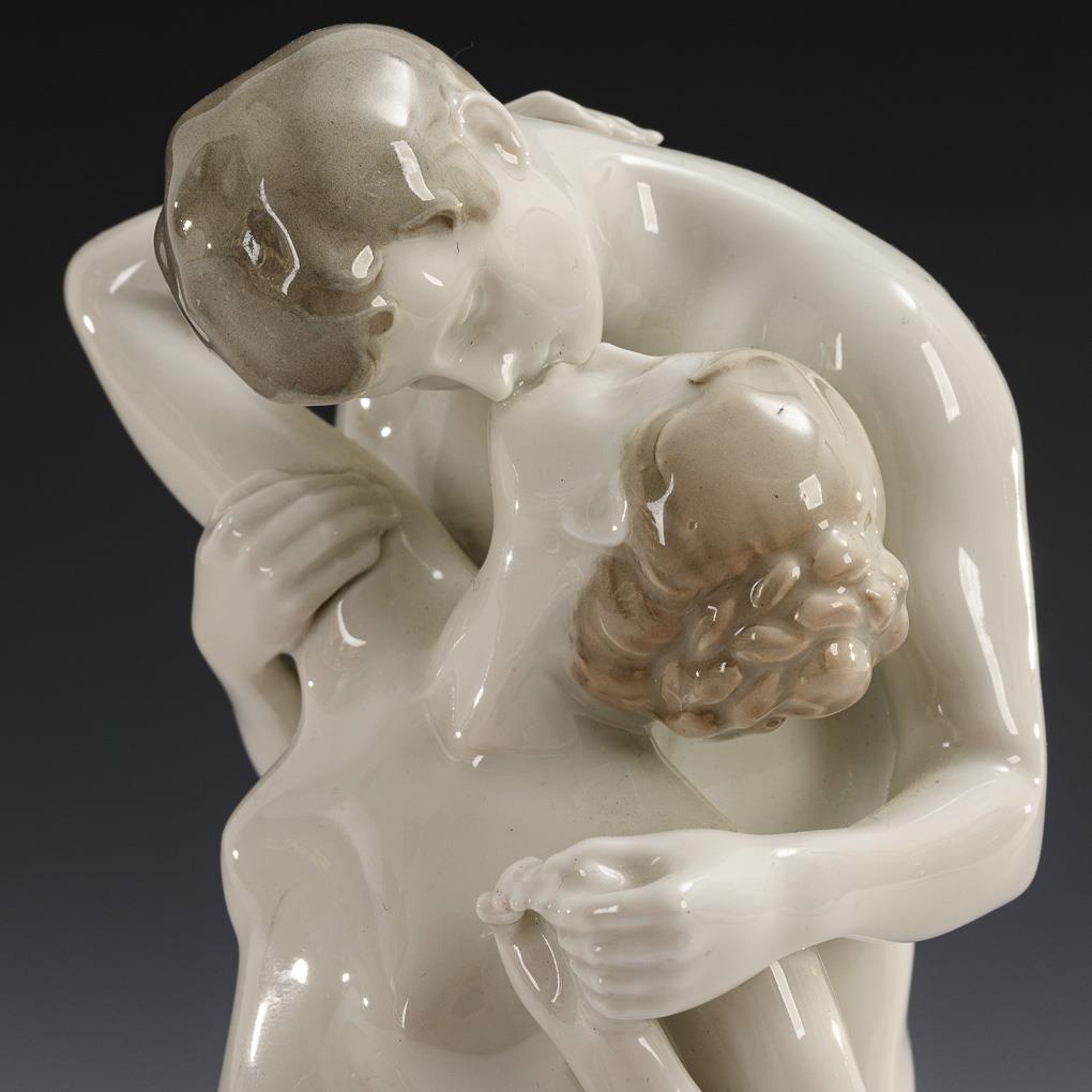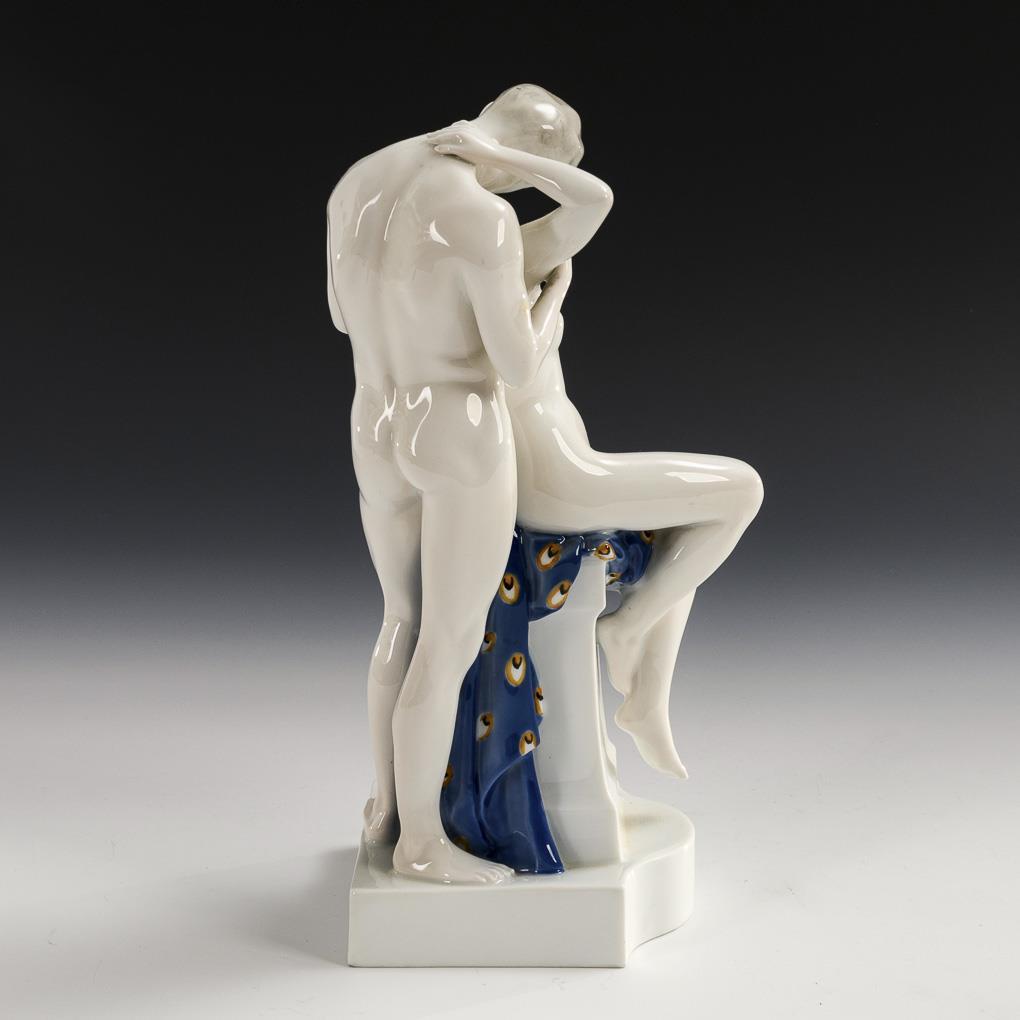 Aktdarstellung einer auf einem Postament sitzenden Frau, den hinter ihr stehenden Mann küssend.
