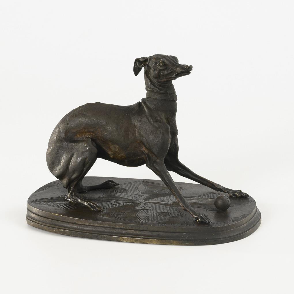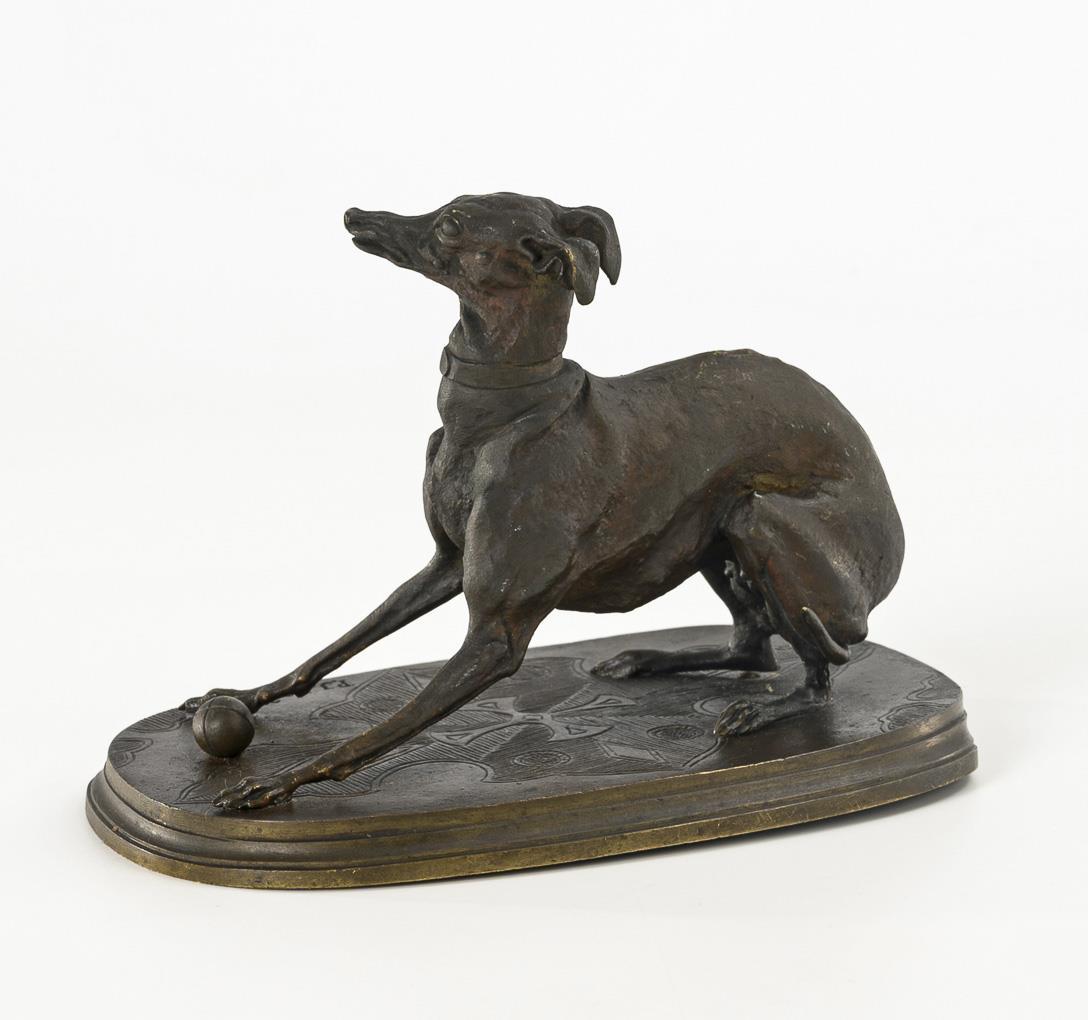 Gestisch zum Spiel auffordernder Hund mit Ball vor sich auf der ornamental verzierten Bronze-Plinthe.