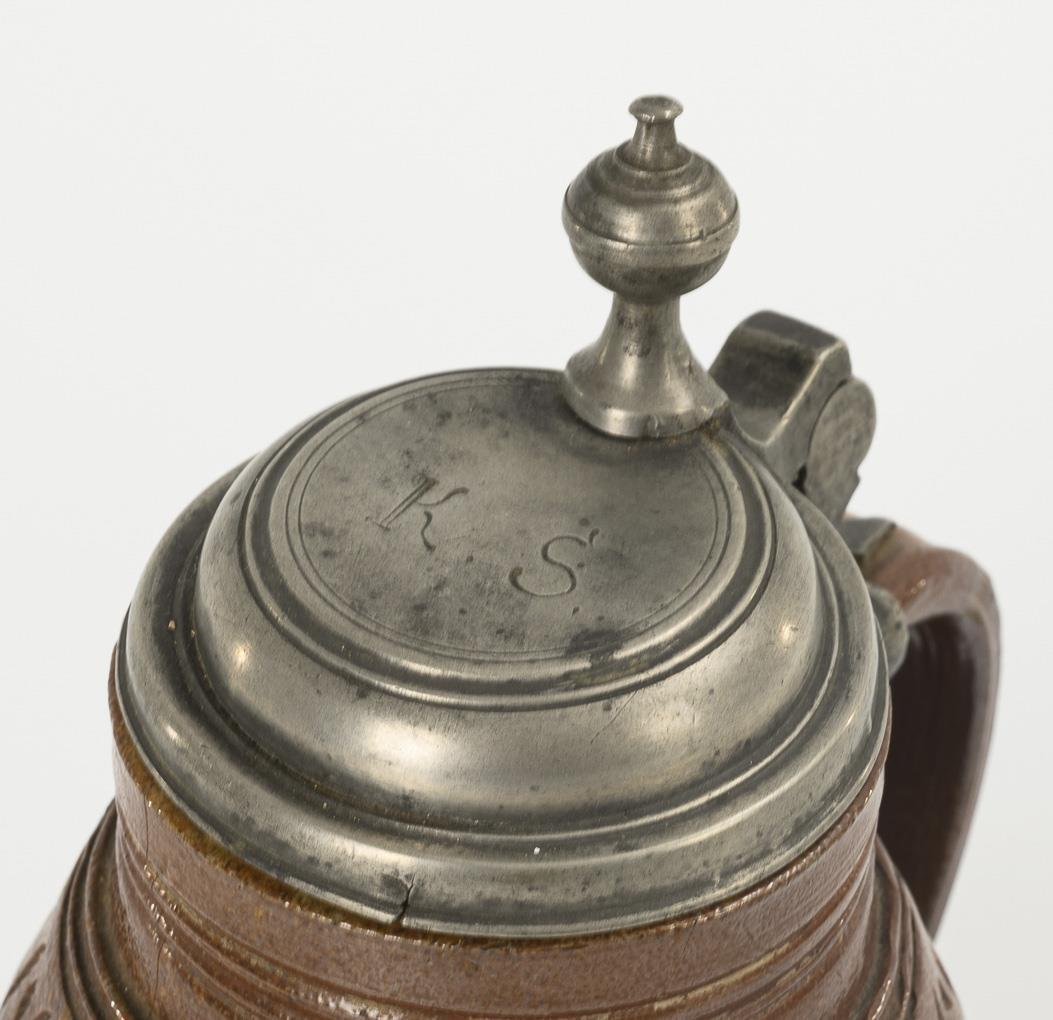 Ovoider Korpus mit leicht gekehltem Bandhenkel, Hals mit Gurtfurchen, Wandungsmitte mit Kerbzier, aufgelegten Rosetten und Linien sowie Quarzsteinen, hoher vertikal gekerbter Ablauf. Zinndeckel mit Kugeldrücker, monogrammiert "K.S.". Im Mündungsbereich 2 feine Risse, Rand und Stand leicht bestoßen.