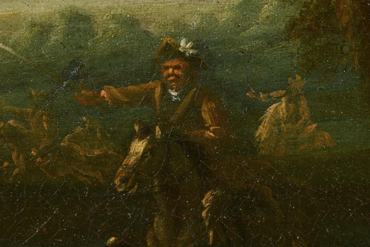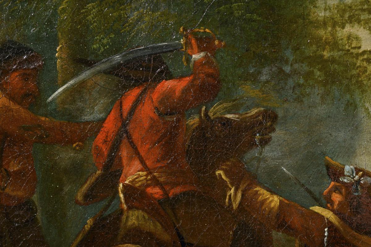 Reiter und Landsknecht im Kampf gegen einen Reiter und dessen gestürzten Gefolgsmann am Waldrand mit nahenden Truppen. Leinwand randdoubliert.