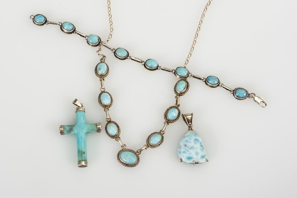 Collier, Armband Anhänger-Kreuz und Anhänger mit wolkighellblauen Steinen.