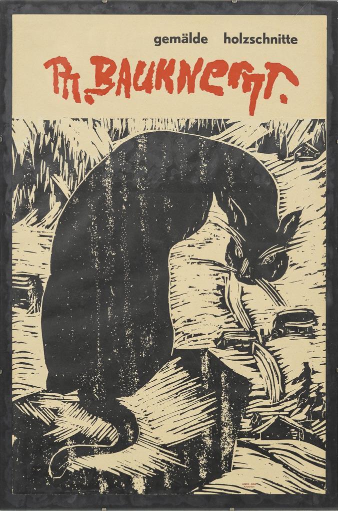 Plakat mit Schriftzug "gemälde holzschnitte Ph. Bauknecht.". Aus zwei Teilen zusammengesetzt. / Gleiches Motiv in anderer Größe als Druckgraphik.