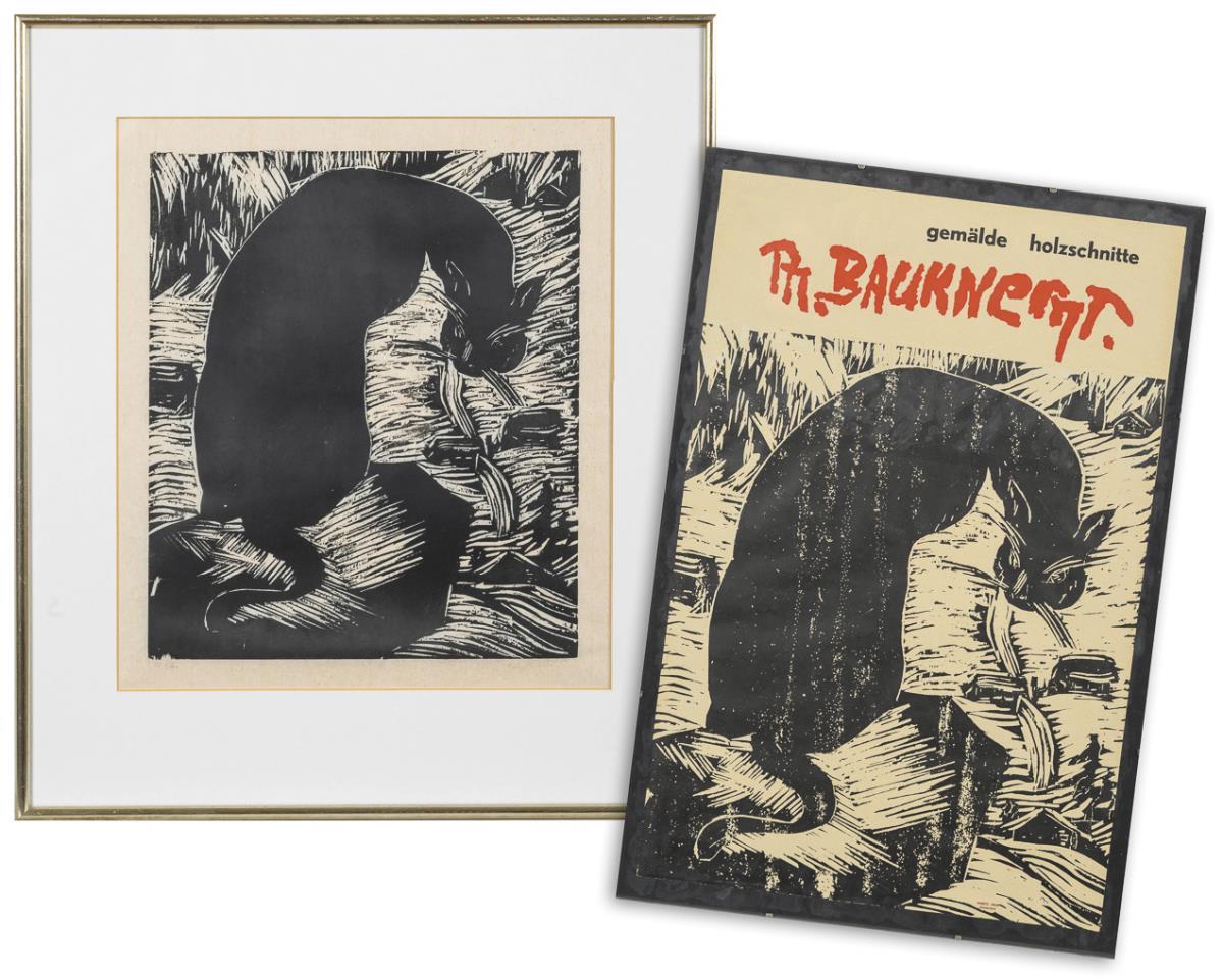Plakat mit Schriftzug "gemälde holzschnitte Ph. Bauknecht.". Aus zwei Teilen zusammengesetzt. / Gleiches Motiv in anderer Größe als Druckgraphik.