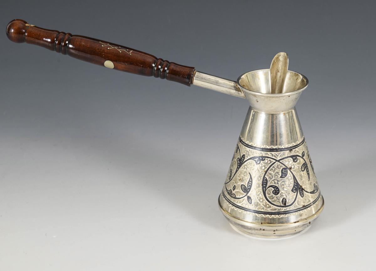 Konische Form, in Niello-Technik verziert, mit seitlichem Drechselgriff.