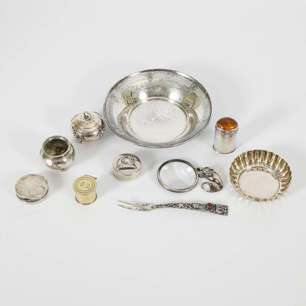 5 verschiedene Döschen, 3 Schälchen und 1 Gabel mit Bernstein. Dazu 1 Lupe mit versilbertem Tiergriff. Gebrauchsspuren.