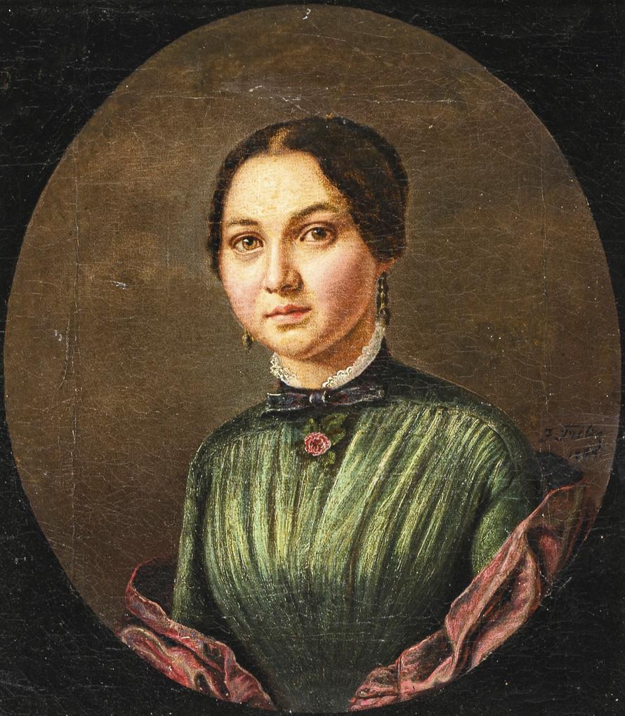 Porträt einer jungen Frau im grünen Kleid mit lilafarbenem Mantel vor neutralem Hintergrund. Leinwand doubliert.