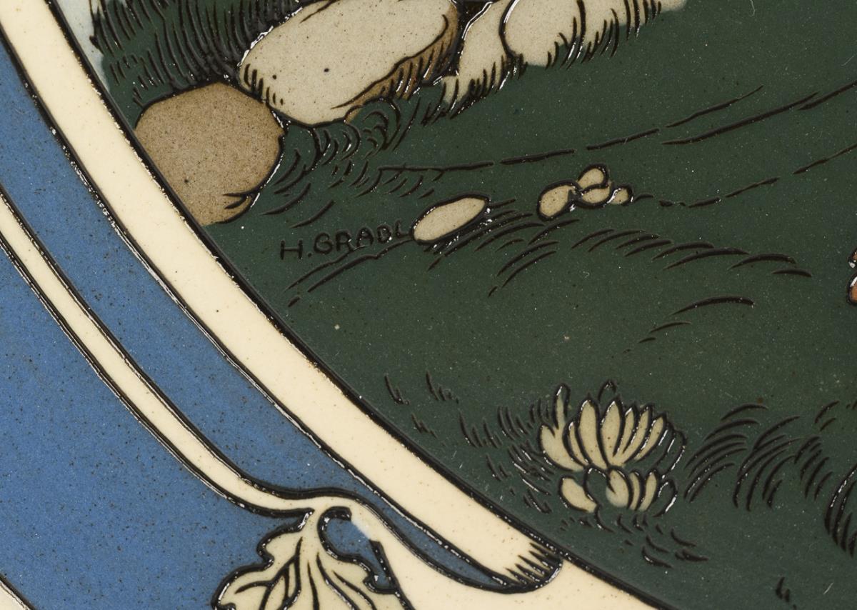 Geprägte Turmmarke "Mettlach" mit Zusatz "Ges. Gesch.", ab 1887. Um 1900. Links unten signiert "H. Gradl". Modell-Nr. 2804.