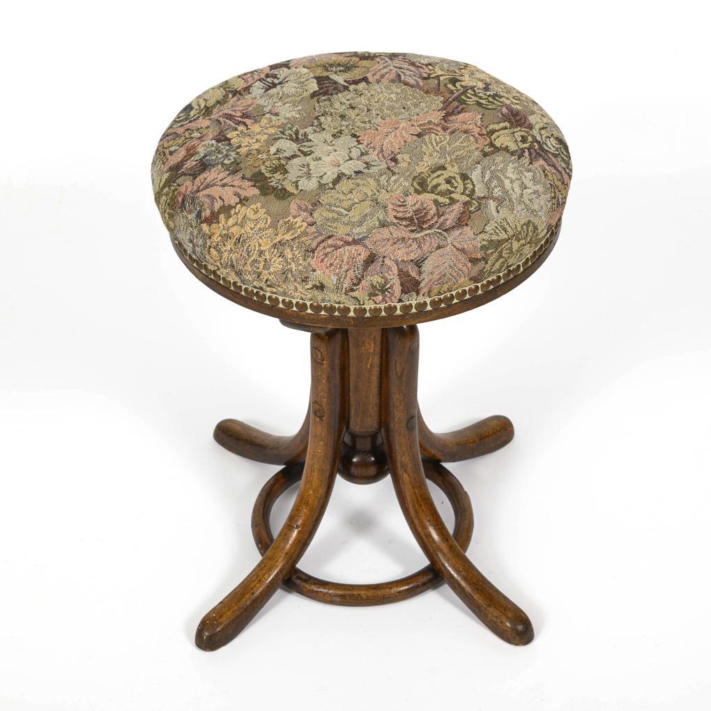 Höhenverstellbarer Bugholz-Hocker, Polstersitzfläche auf Gewindestange und floralem Stoffbezug, auf 4 gebogten Beinen mit Rundverstrebung. Polstersitzfläche und Schrauben erneuert, leichte Gebrauchsspuren.