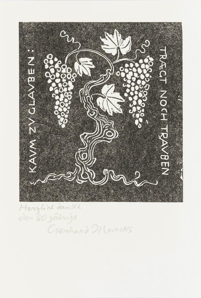 Einmal gerahmt "Durch Kunst wird alle Welt erlöst die unerwacht im Dunkel döst", darunter handschriftlich "Ein gutes 1965: Gerhard und Maria Marcks", ein weiteres lose mit einer Weinrebe, an der zwei Traubendolden hängen, umgeben vom Spruch "Kaum zu glauben: Trägt noch Trauben", darunter handschriftlich "Herzlich dankt der 80 jährige Gerhard Marcks".