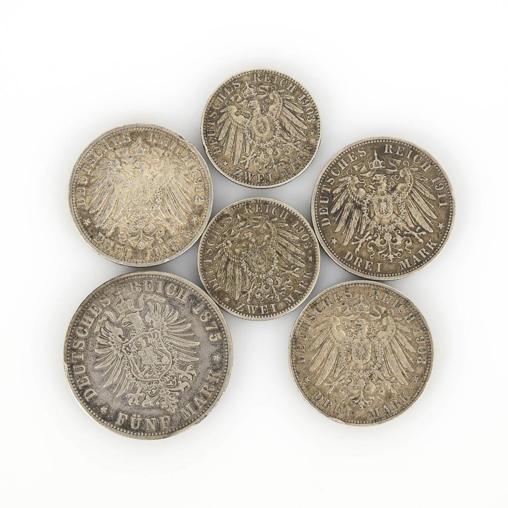 5 Mark, 1875, "Ludwig II. König v. Bayern", Münzstätte D. / 2x 3 Mark. 1908 und 1911, "Freie und Hansestadt Hamburg", Münzstätte J. / 2 Mark, 1903, "Freie und Hansestadt Hamburg", Münzstätte J. / 3 Mark, 1912, "Wilhelm II Koenig von Wuerttemberg", Münzstätte F. / 2 Mark, 1903, "Otto Koenig von Bayern", Münzzstätte D. Zustand: sehr schön.