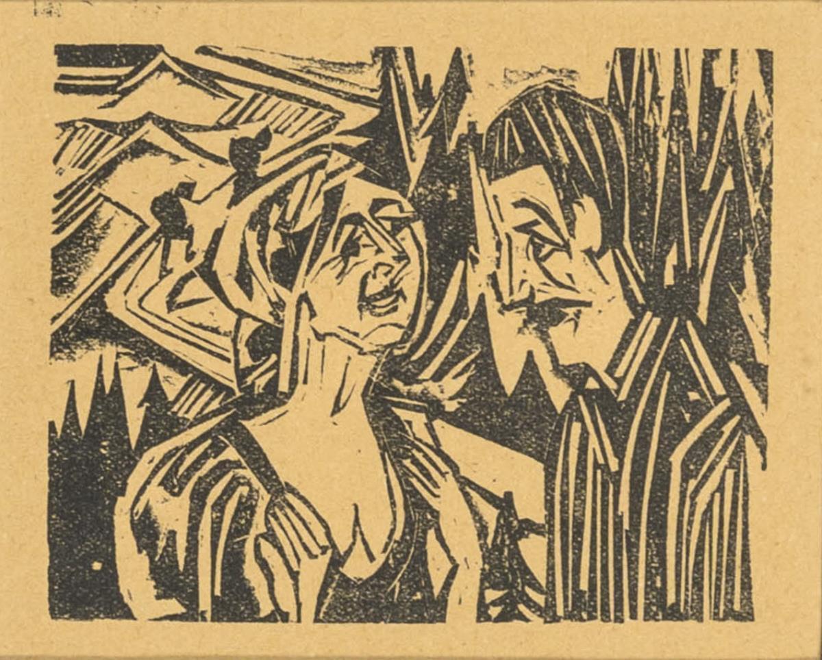 Oberkörperbildnisse eines Mannes und einer Frau, scheinbar im Gespräch, eine von Kirchners insgesamt 24 illustrierenden Grafiken zu Jakob Boßharts Erzählung "Wie Josua Grübler seinen Weg fand", herausgegeben in dessen Sammlung von 6 Novellen mit dem Gesamttitel "Neben der Heerstraße" von 1923.