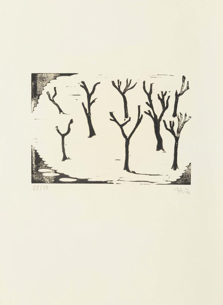Linolschnitt. Unten rechts mit Bleistift signiert. Meer: 111/50; Baum: 90/50; Wald: 88/50.