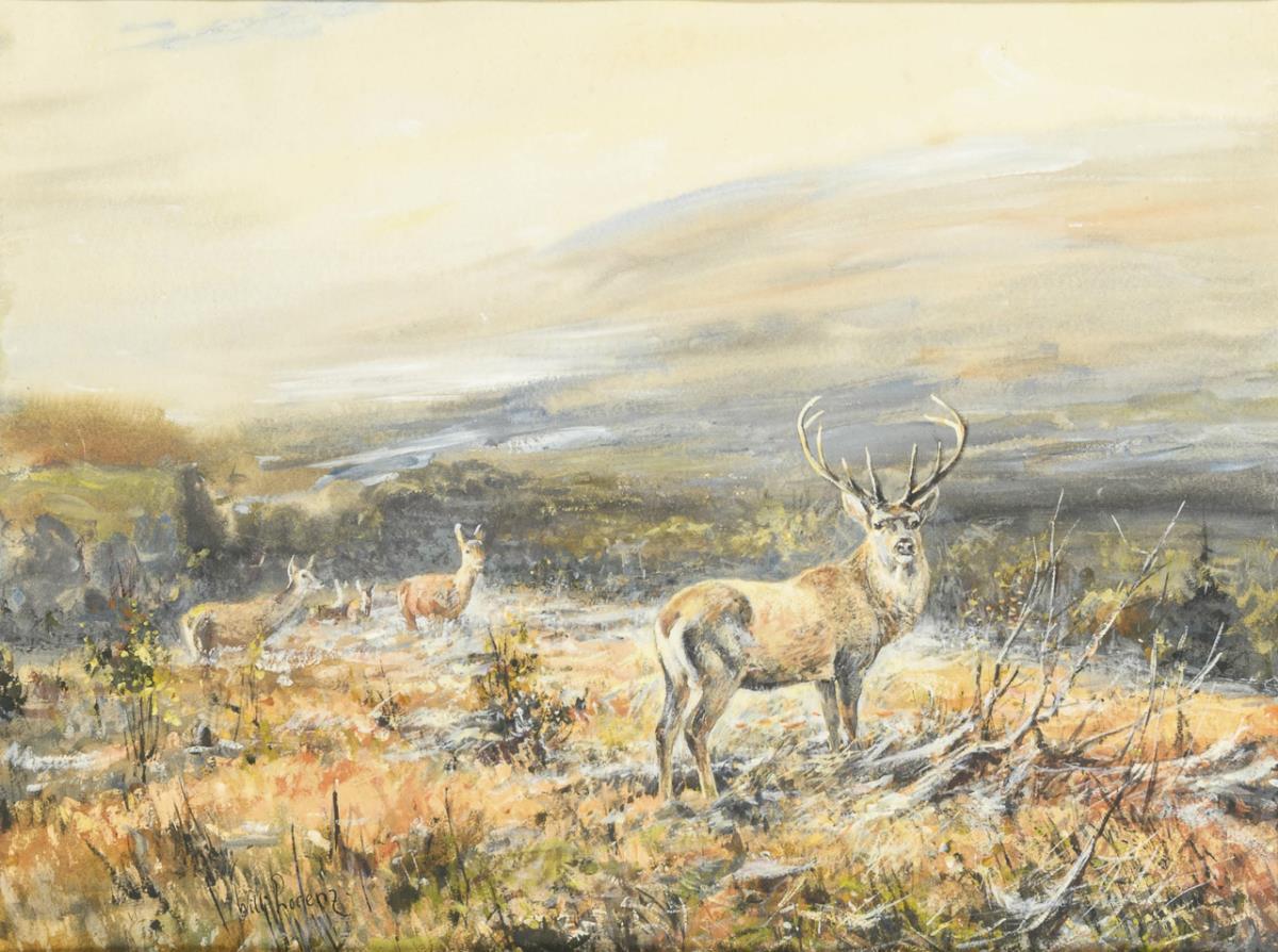 Der Hirsch mit der Herde auf einem Berg oberhalb des Waldes unter grauem Wolkenhimmel.