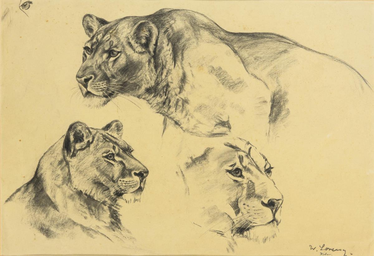 Studienblatt mit 3 Zeichnungen einer Löwin, verschiedene Ansichten, kleine Zeichnung eines Auges. Papier oben links leicht stockfleckig, leicht gewellt, unten rechts leicht geknittert.