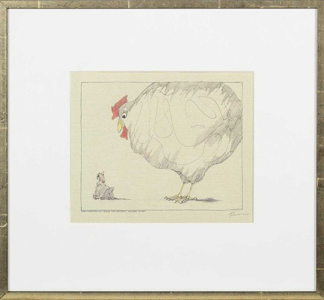 Karikatur eines großen Huhnes und eines kleinen Mannes. Nachdruck?.