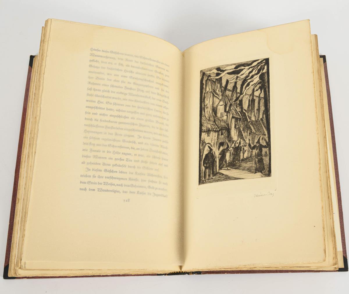 Nummeriertes Exemplar 191/400. "Die Nummern der Ausgabe B (146-200) haben handschriftlich unterzeichnete Radierungen ohne Remarquen ...". 174 Textseiten und 11 Originalgrafiken, im unbeschnittenen Buchblock, goldgeprägter Halbledereinband. Einband berieben.