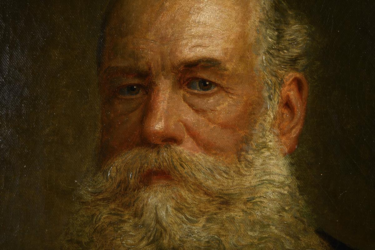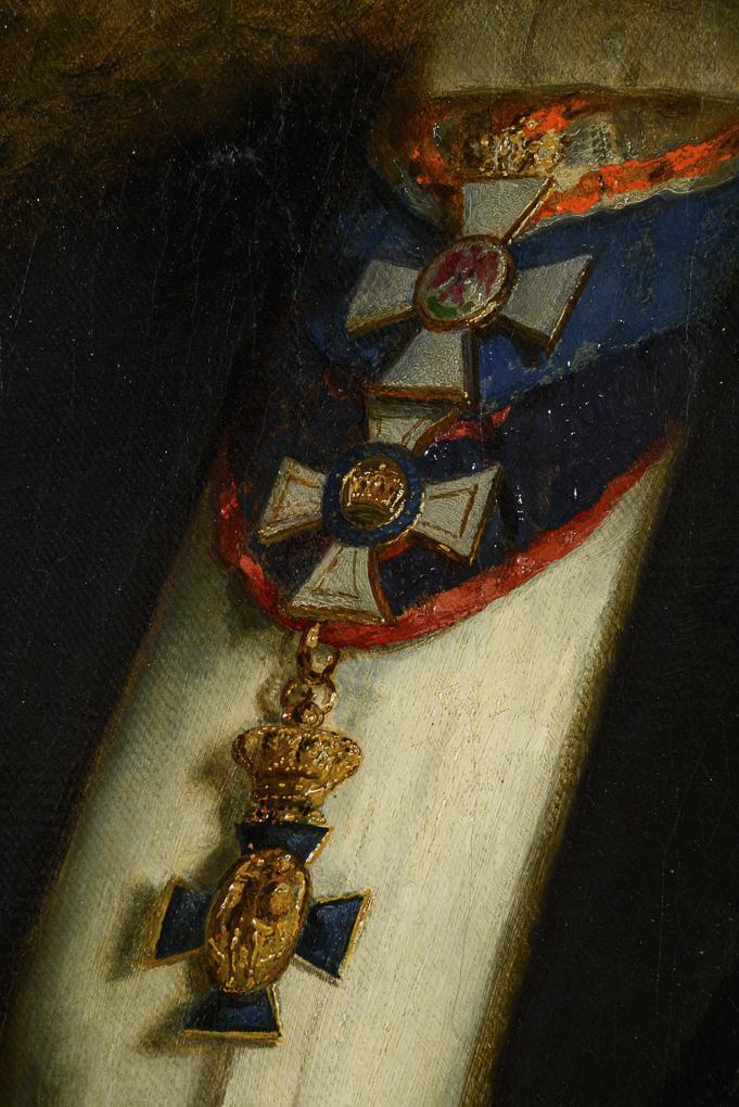 Porträt eines älteren Mannes im schwarzen Anzug mit Zwickel, Komturkreuz des Roter Adlerordens mit Eichenlaub, Komturkreuz des Königlichen Kronen-Ordens Preußen, Komturkreuz des Verdienstordens vom Heiligen Michael und dem Eisernen Kreuz mit Jubiläums-Eichenlaub, an einem Tisch, auf eine Zeitung gestützt. Leichte Altersspuren.