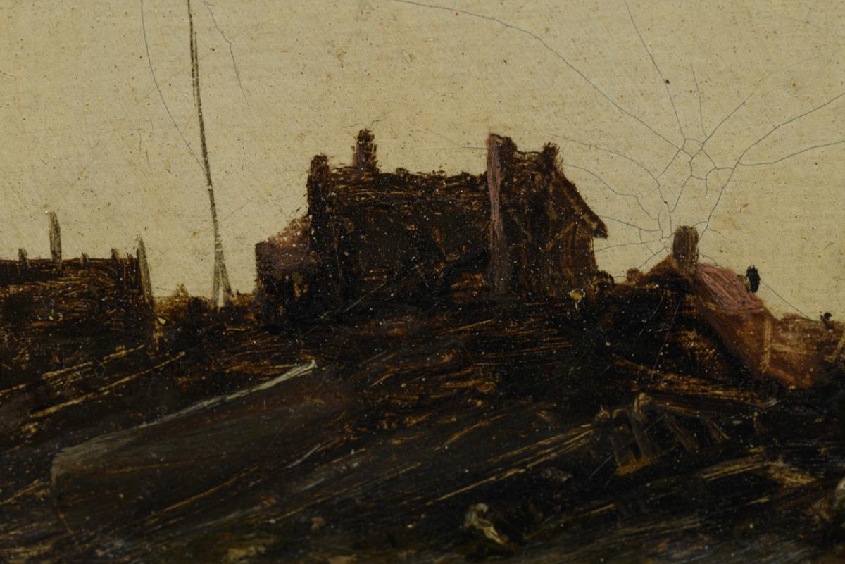 Fischersleute unter dunklen Wolken und starkem Wind beim Boot an der Küste. Leinwand doubliert.
