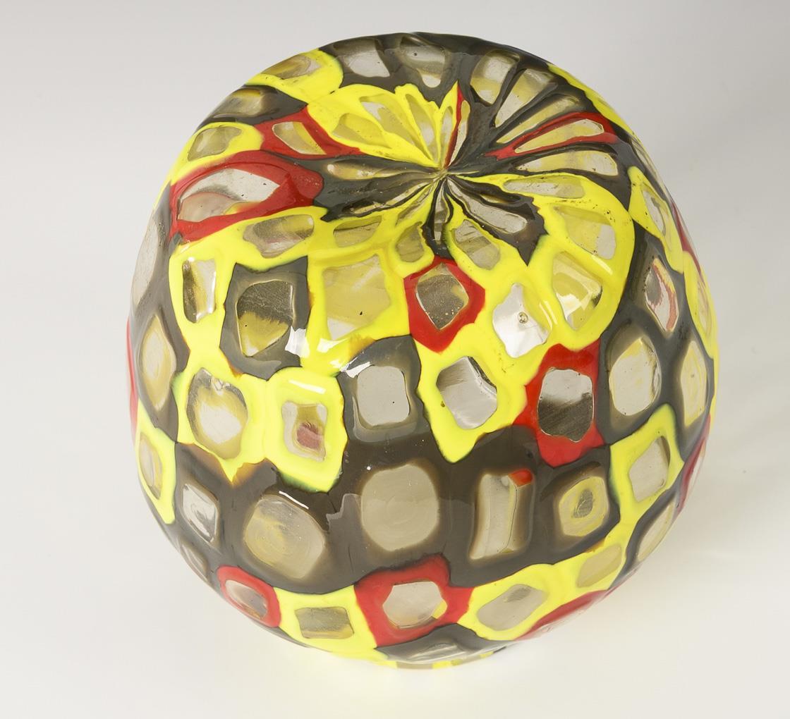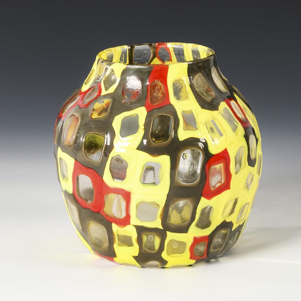 In der Art eines Mosaiks gestaltete Balustervase aus farblosen, von opalgelbem, rotem und braunem Glas gefassten Glassteinchen.