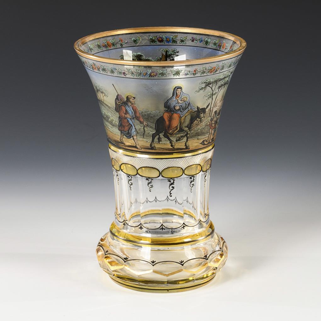 Vase in Form eines Ranftbechers mit Facetten- und Steinelschliff. Umlaufend transparentemailbemalt mit einer weiten Landschaft, darin die Darstellung der Heiligen Familie auf der Flucht nach Ägypten. Gold etwas berieben.