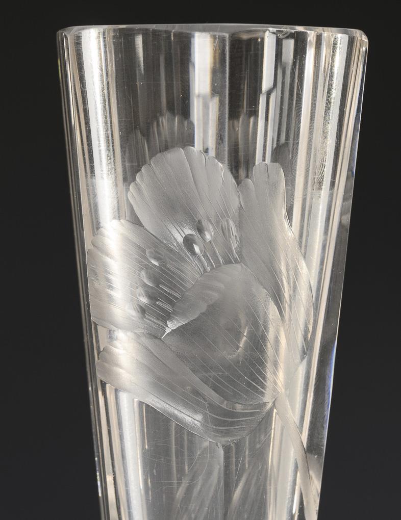 1x konisch-schlanke, sechsfach facettierte Vase mit mattgeschnittenem Tulpendekor (H 27,5 cm). / 1x facettierter Ranftbecher mit mattgeschnittenem Rosendekor (H 9,5 cm). Vasenstand mit kleinen Bestoßungen.