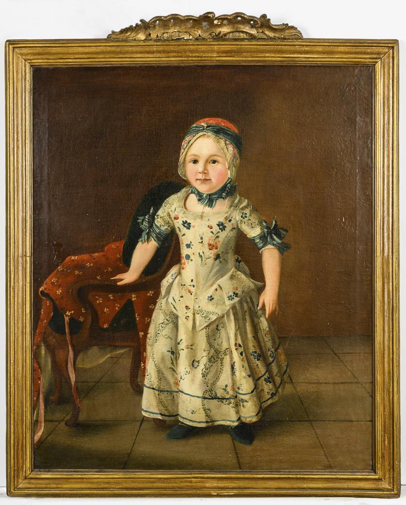 Porträt eines Mädchens im geblümten hellen Kleid, an einem Armlehnstuhl auf gefliestem Boden. Zwei restaurierte Stellen mit Hinterklebungen.