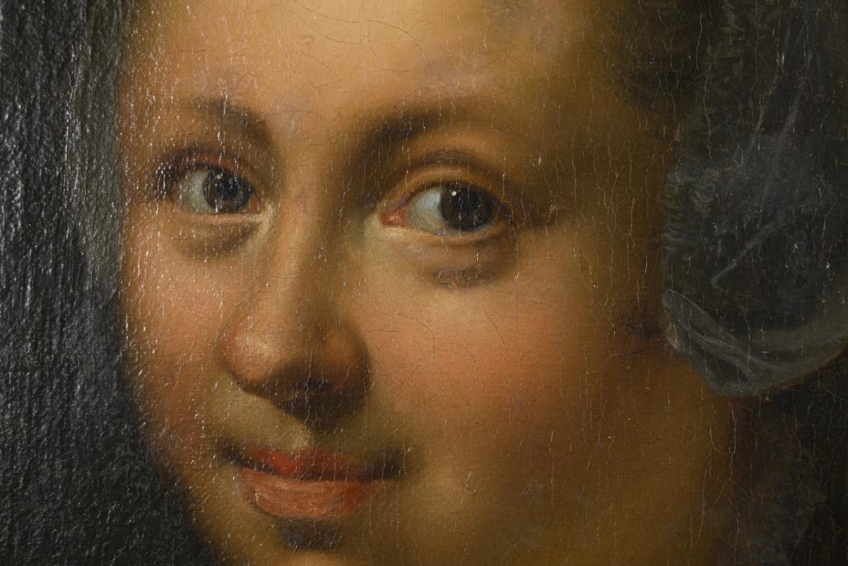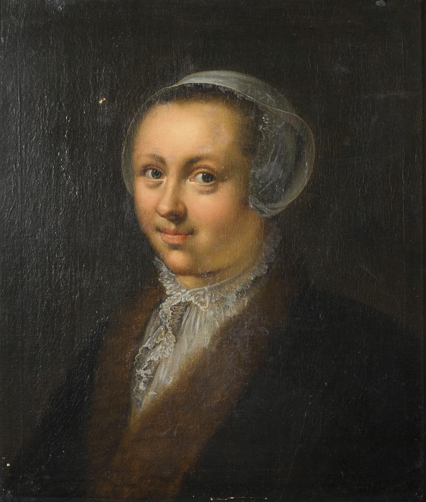 Porträt der lächelnden Dame mit leichter Spitzenhaube und pelzverbrämtem Mantel vor neutralem Hintergrund. Leinwand doubliert.