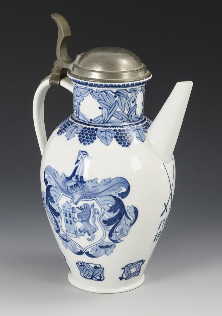 Balusterkorpus mit Bandhenkel, Röhrenausguß und zinnmontiertem Scharnierdeckel. Auf der Wandung die Darstellung des Meißener Stadtwappens und des sächsischen, von zwei Löwen flankierten Wappens.