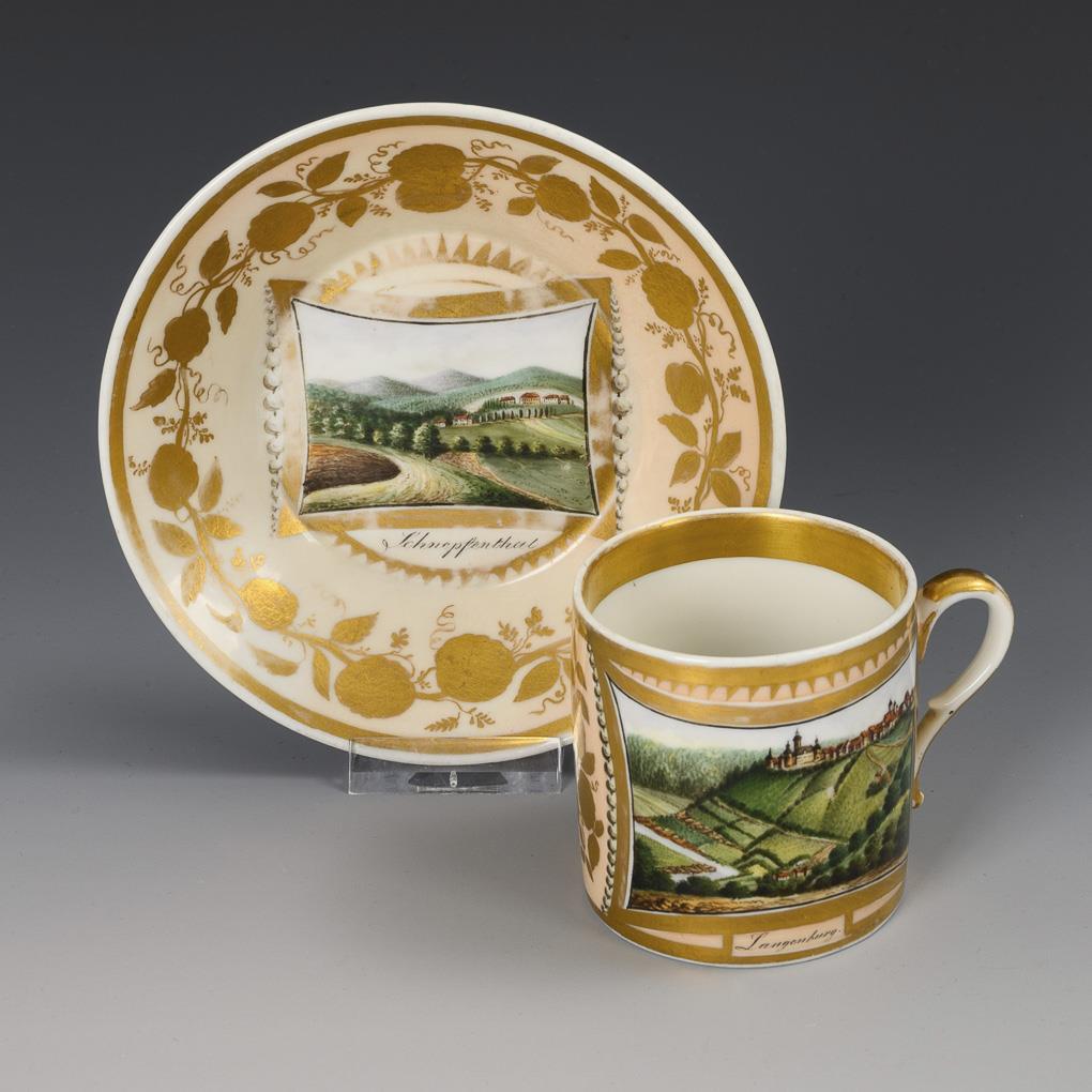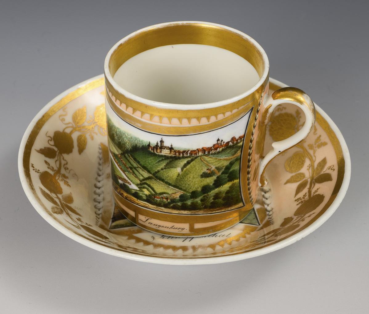 Zylindertasse mit Ohrenhenkel. Beidseitig und im Spiegel der Untertasse eine goldgerahmte Rechteckkartusche mit den bezeichneten Ansichten von Gotha, Langenburg und Schnepfenthal, verso apricotfarbener Fond mit floraler Goldmalerei. Partieller Goldabrieb.
