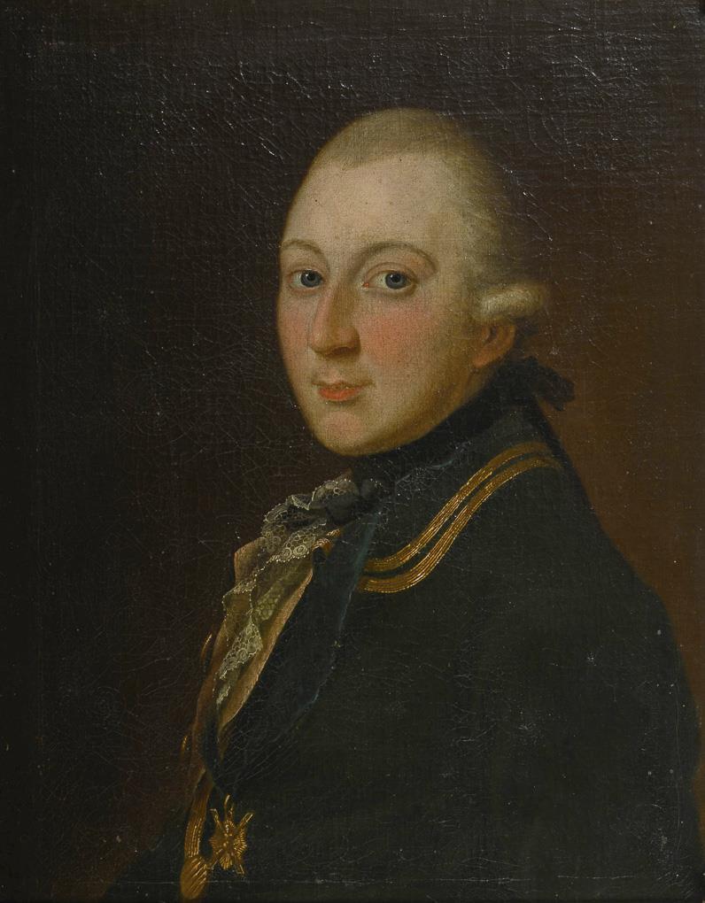 Porträt eines jungen Adligen mit weißer Zopfperücke und grünem Gehrock mit goldenem Ornament und Orden. Leinwand doubliert.