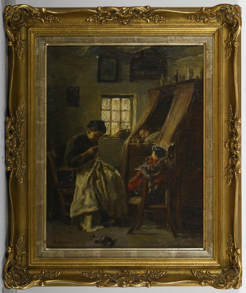 Die Mutter bei der Handarbeit in der Stube mit den beiden Kindern.