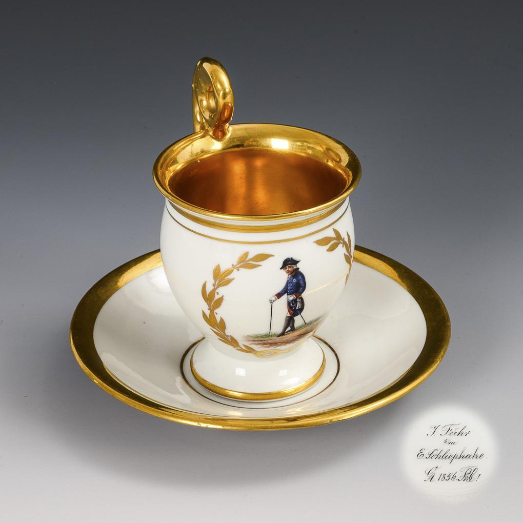 Polychrom bemalt, goldstaffiert. Tasse (H 10,5 cm), originale Untertasse (Ø 13,5 cm).