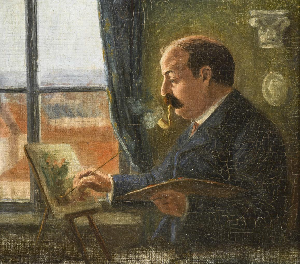 Älterer Mann mit Pfeife und im Anzug an der Staffelei vor dem Fenster. Altersspuren.