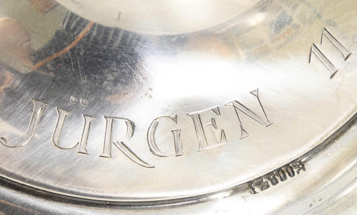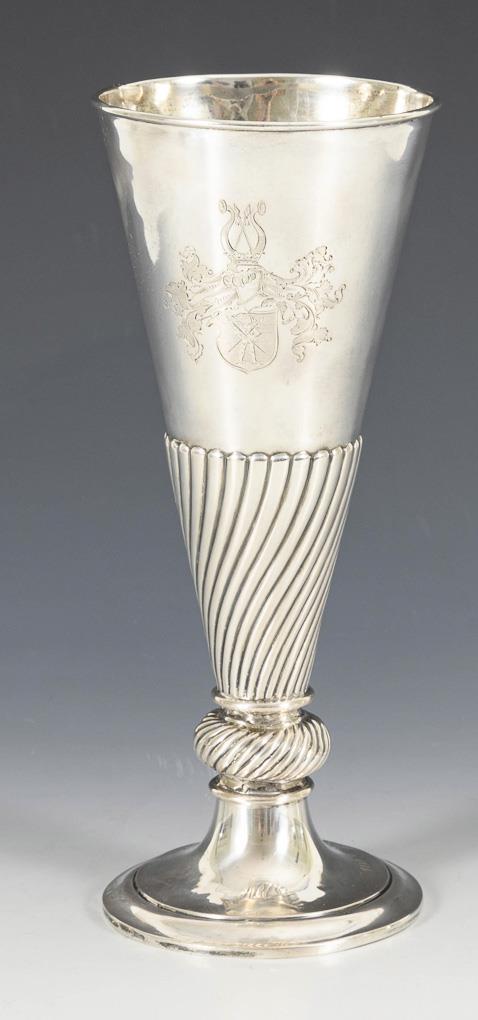 Konischer, teilgerippter Fußbecher mit Wappengravur und Widmung. Auf der Kuppa: verschlungenes Monogramm, "Großonkel Ferdinand Lucius 1900", am Fuß: "Jürgen 11. 5. 51 Heidi". Alte Reparatur am Fuß.